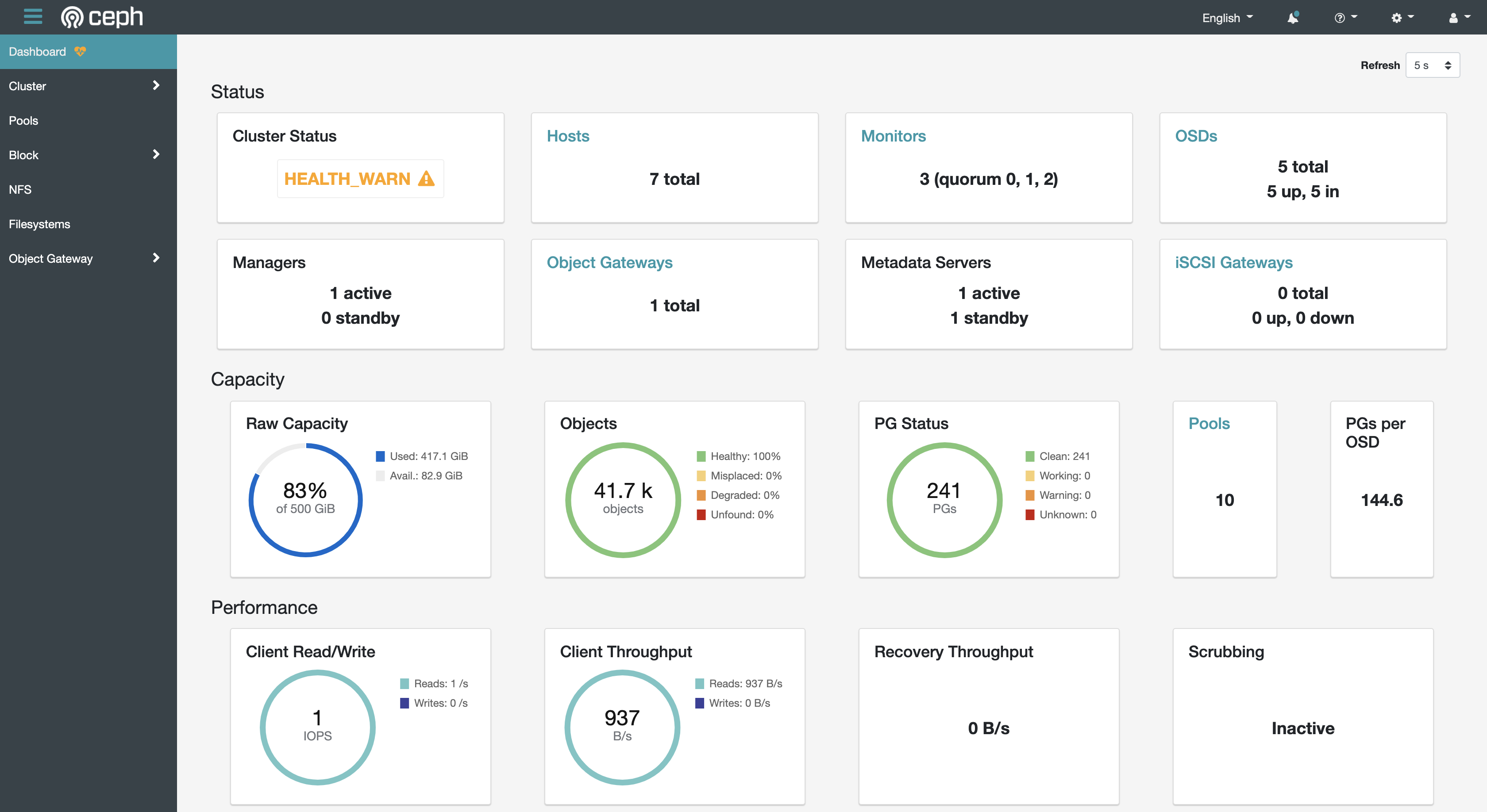Ceph Cluster의 상태를 모니터링하기 위해 Ceph Dashboard를 설치하면 아래와 같이 Ceph 클러스터의 상태를 한 눈에 보면서 관리 기능을 사용할 수 있다.