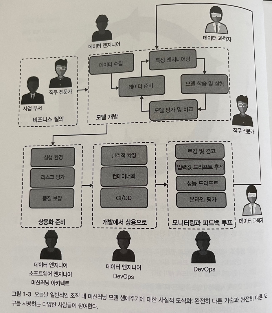 일반적인 조직 내 머신러닝 모델 생애주기에 대한 사실적 도식화라고 표현한 그림이다.