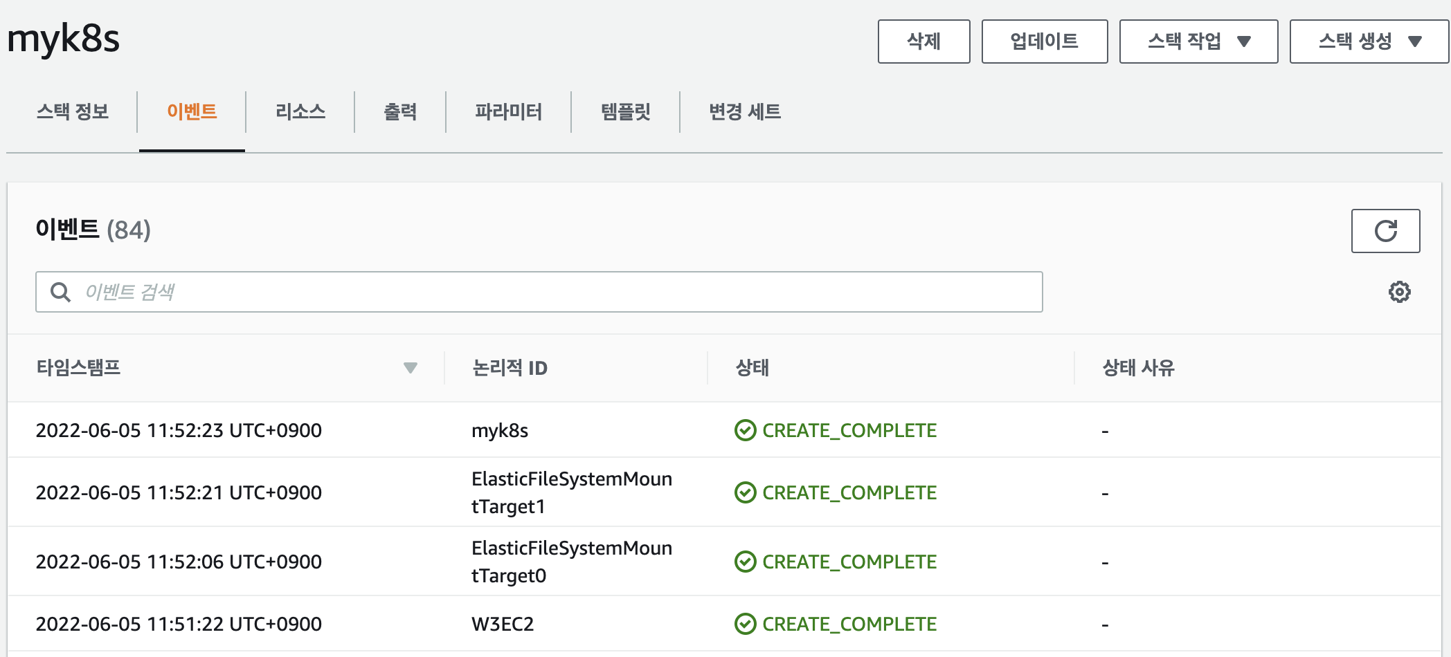 CloudFormation에서 확인해보면 잘 생성된 모습을 확인할 수 있다.