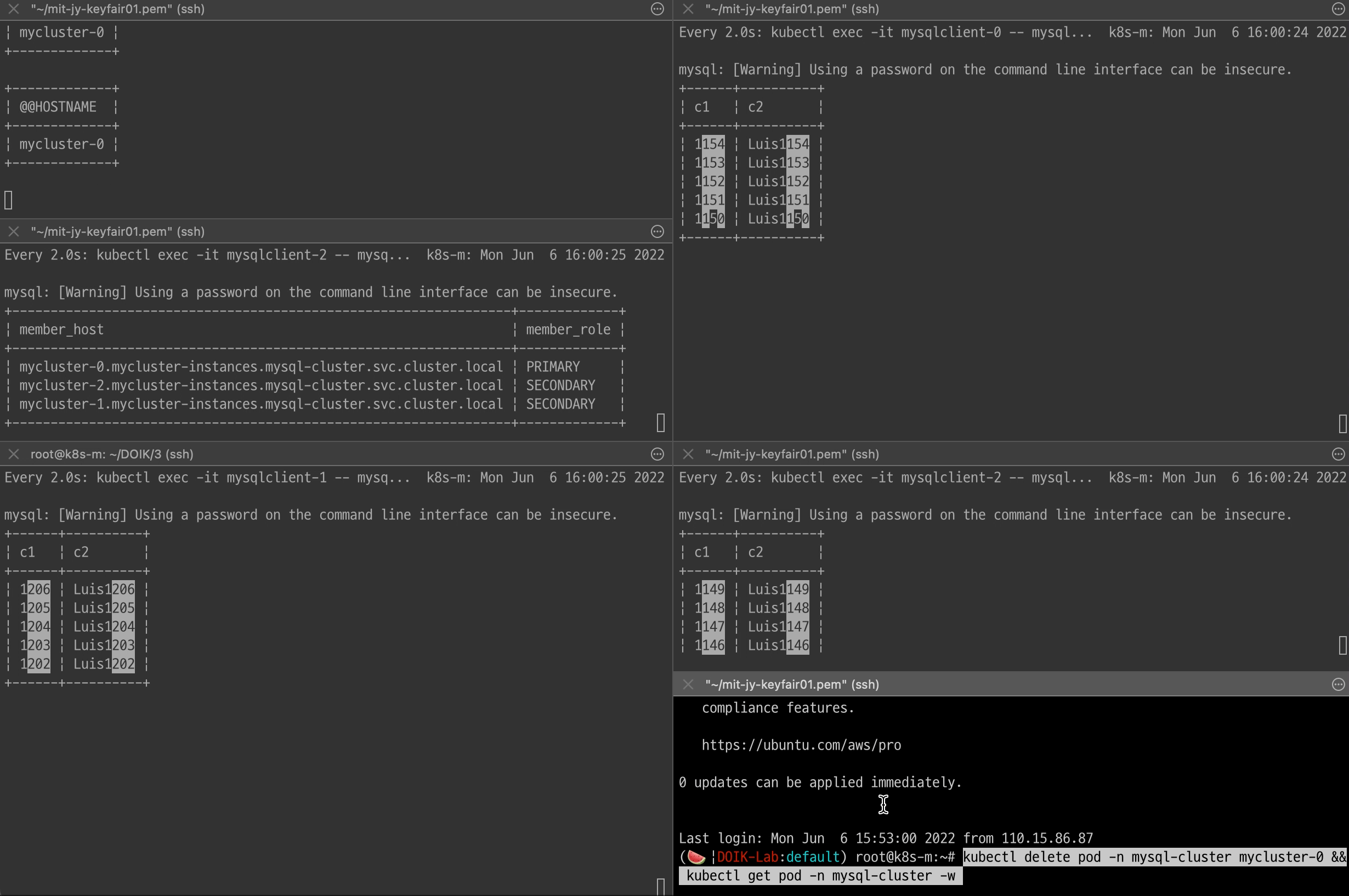 watch -d "kubectl exec -it mysqlclient-2 -- mysql -h mycluster-2.mycluster-instances.mysql-cluster.svc -uroot -p**** -e 'select member_host,member_role FROM performance_schema.replication_group_members;'"