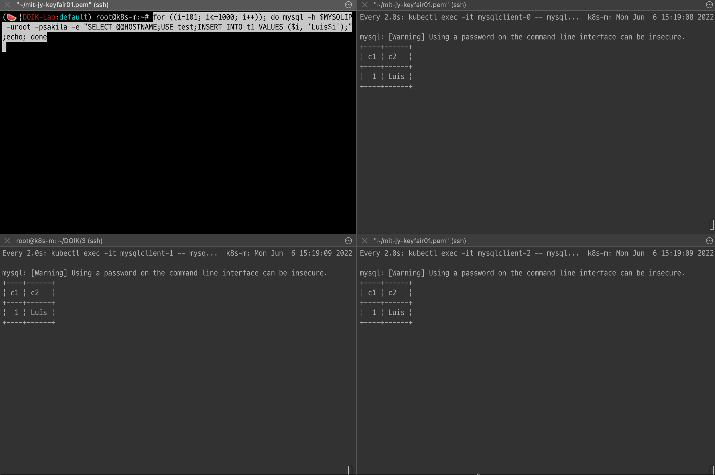 watch -d "kubectl exec -it mysqlclient-0 -- mysql -h mycluster-0.mycluster-instances.mysql-cluster.svc -uroot -p**** -e 'USE test;SELECT * FROM t1 ORDER BY c1 DESC LIMIT 5;'"