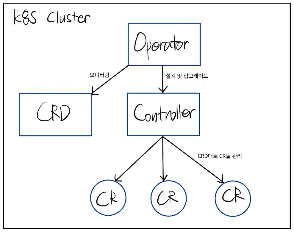 쿠버네티스의 오퍼레이터 패턴 개념을 통해 쿠버네티스 코드 자체를 수정하지 않고도 컨트롤러를 하나 이상의 사용자 정의 리소스(custom resource)에 연결하여 클러스터의 동작을 확장할 수 있다. 오퍼레이터는 사용자 정의 리소스의 컨트롤러 역할을 하는 쿠버네티스 API의 클라이언트이다.