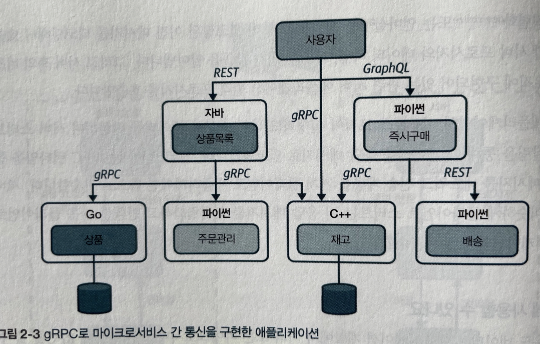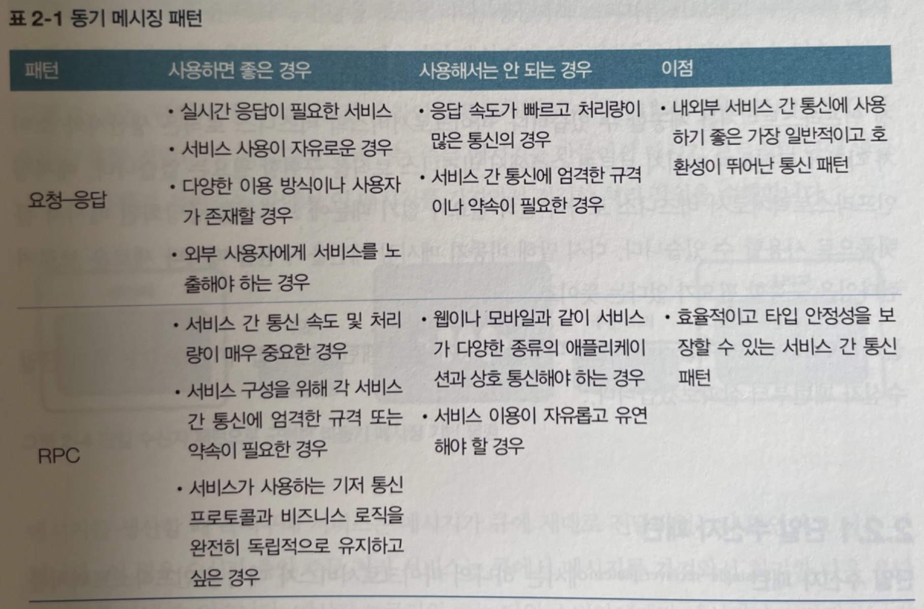 "요청-응답 패턴은 반드시 외부 사용자나 시스템, 혹은 마이크로서비스 간에 서로 메시지를 계속 주고받는 방식으로 통신할 때만 사용하는 것이 좋습니다. 그 외의 경우에는 이 장의 나중에 살펴볼 비동기 통신 방법을 사용하는 것이 좋습니다. 애플리케이션 개발에서는 요청-응답 패턴과 다른 통신 패턴을 같이 사용하는 경우가 많습니다."