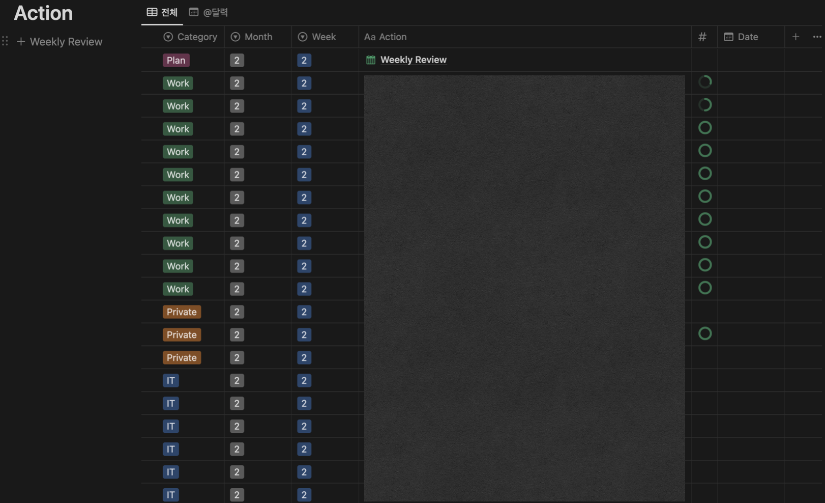 월간과 마찬가지로 좌측 상단에 주간 리뷰를 할 수 있는 신규 페이지 생성 버튼이 있다.