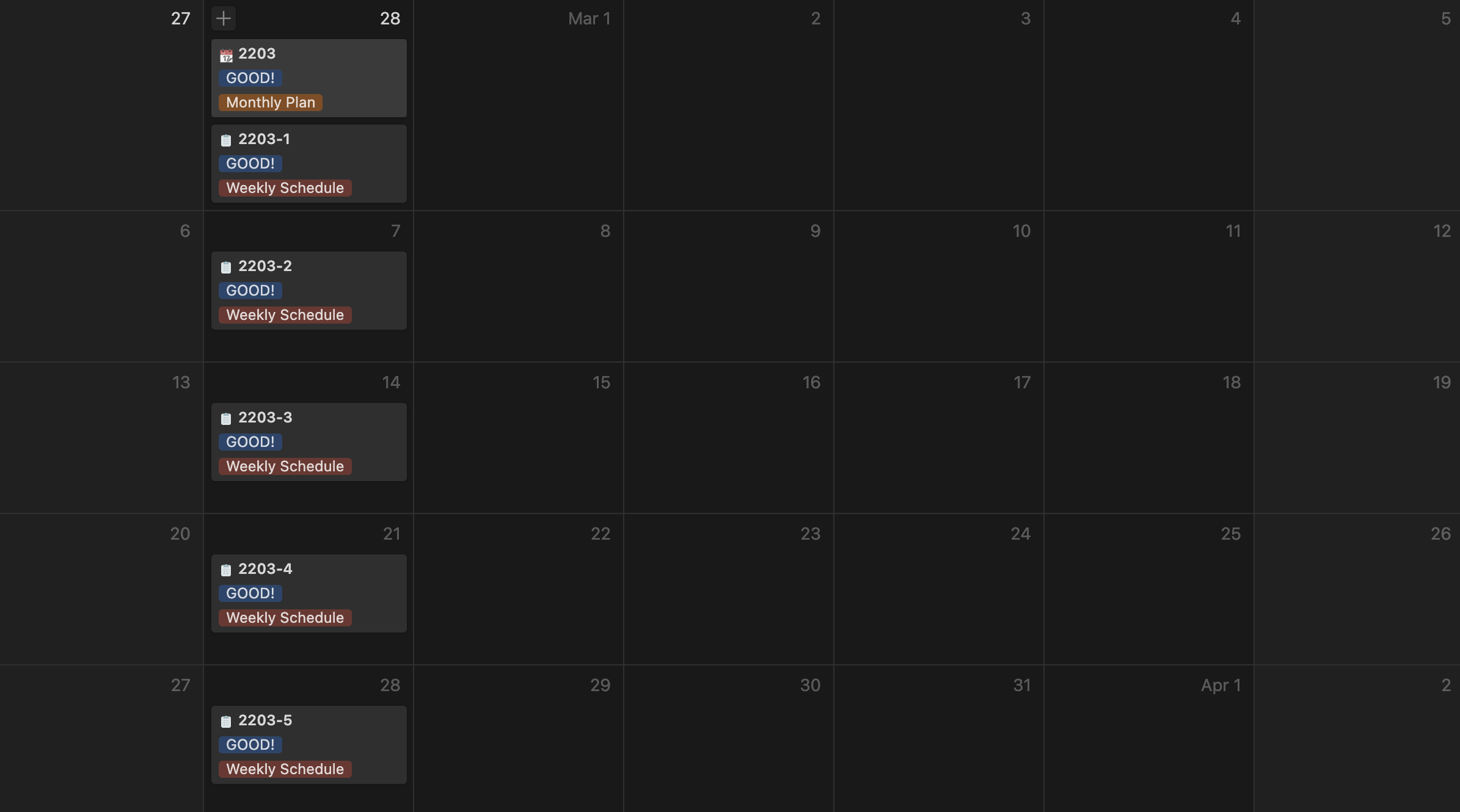 Notion의 달력 기능을 사용하였다. 매월, 주 초 목표 페이지를 생성한다.