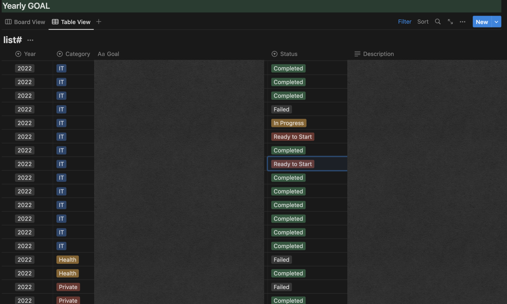 연간 달성해야 할 목표를 나열하고 카테고리별로 정렬을 해두었다.