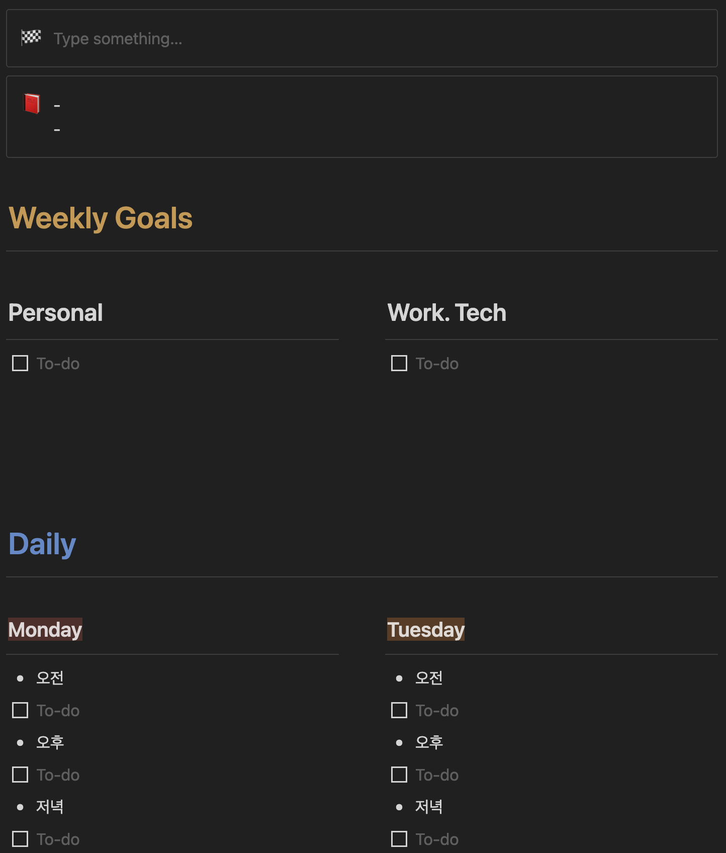 주로 월, 주간 목표를 달성하지 못한 이유를 다시 돌이켜보고 다음 번에는 그러지 않기를 바랐다.