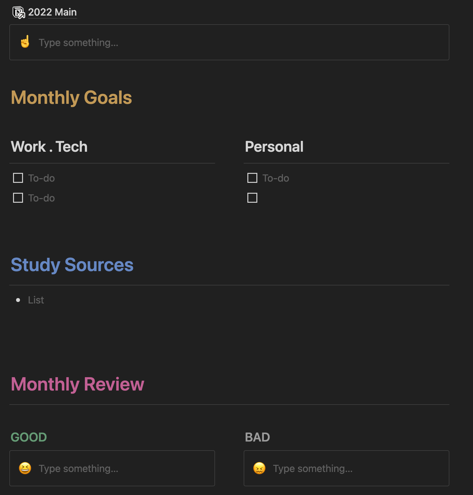클릭하면 2022년의 월별 템플릿이 나온다. 매 월 새로 생성하고 월말에 회고 내용을 작성한다.