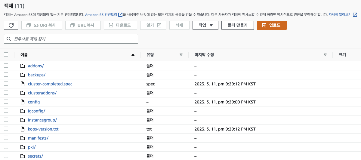 아까 생성한 S3 bucket에는 어떤 것들이 저장되는지 확인해볼 수 있다.