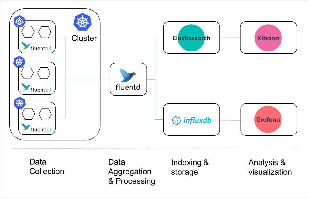 Fluentd가 이를 모아서 처리하고 Elasticsearch나 Influexdb로 보내는 형태입니다.