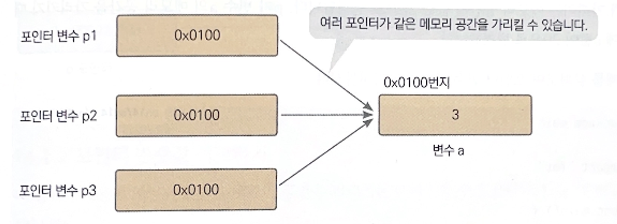 - 포인터를 이용하면 여러 포인터 변수가 하나의 메모리 공간을 가리킬 수도 있고,