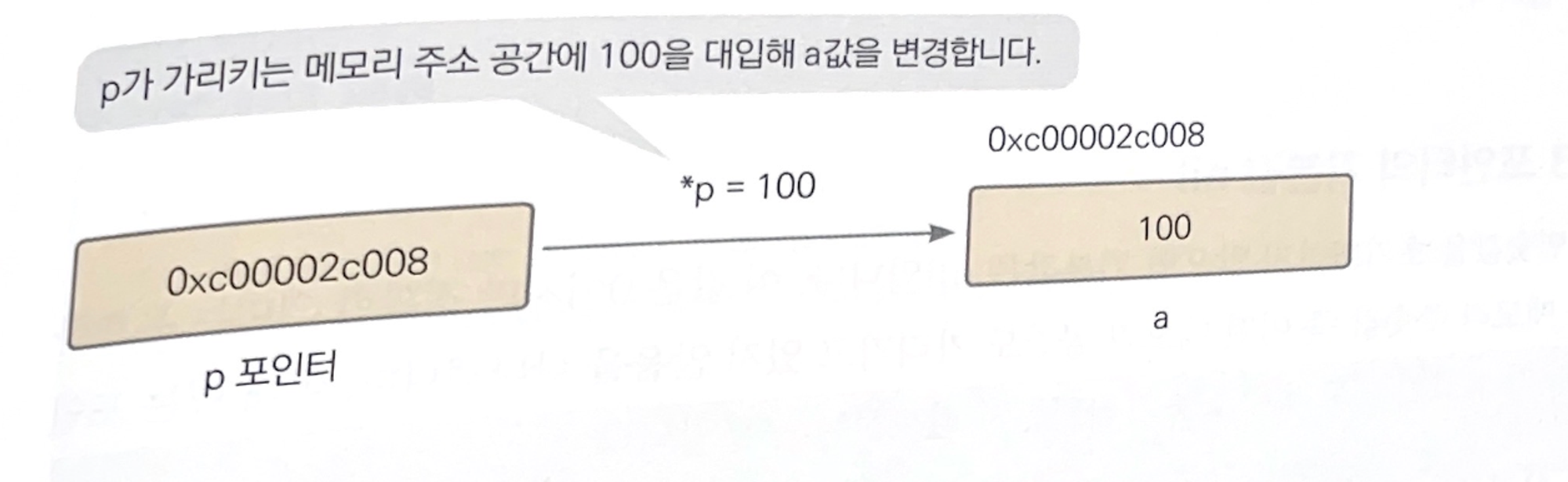 - 포인터가 가리키고 있는 메모리 공간의 값을 읽을 수도 변경할 수도 있다.