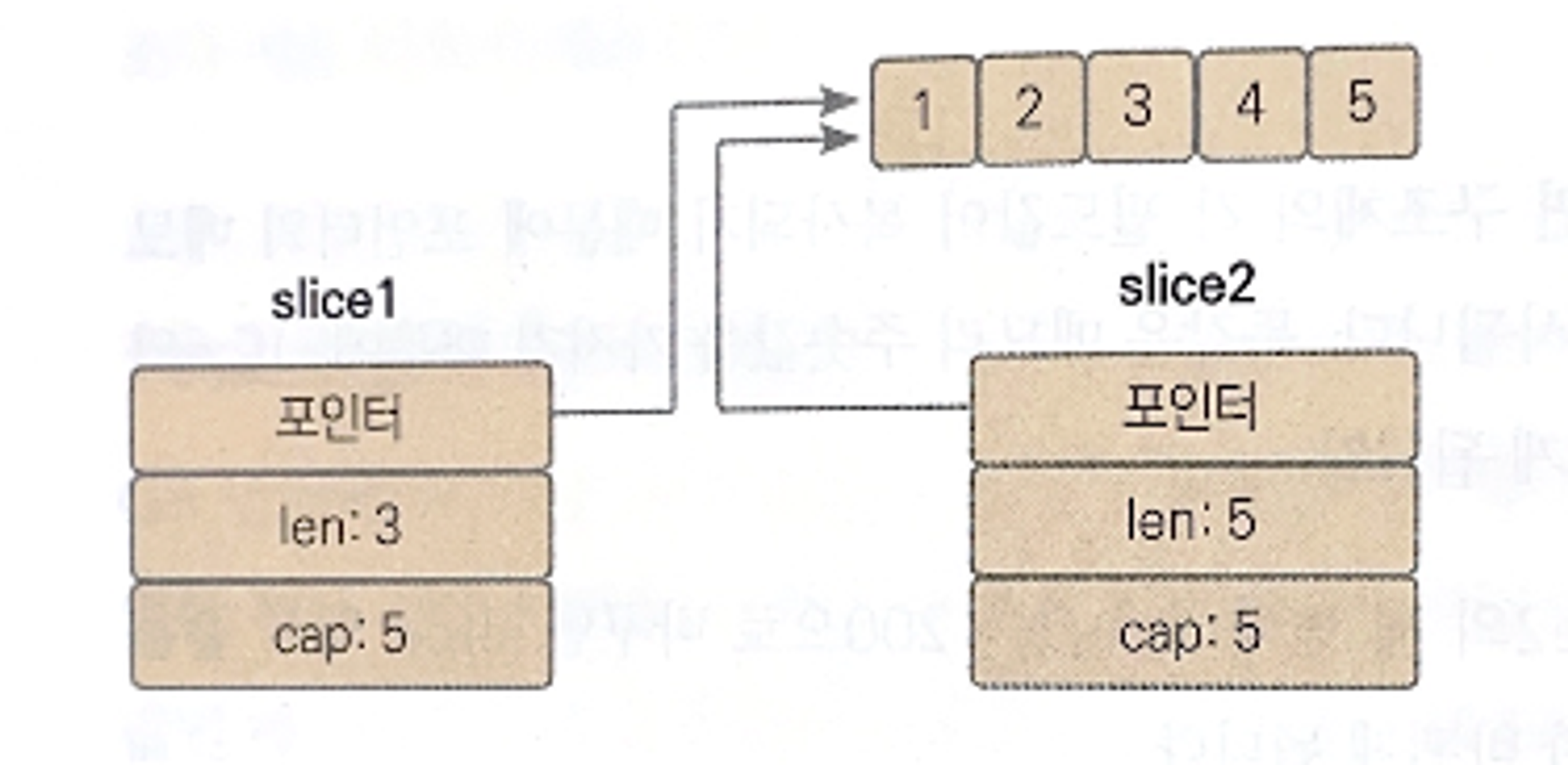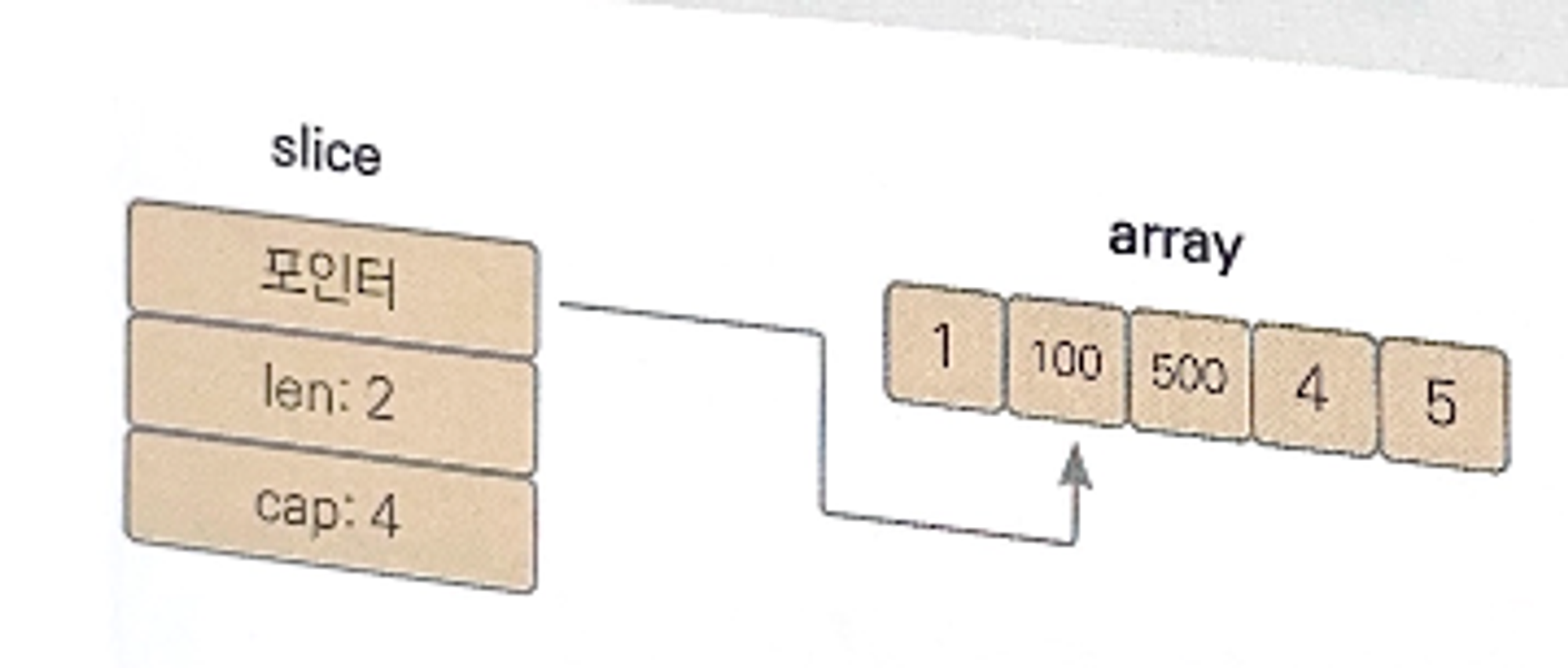 - 슬라이스가 실제 배열을 가리키는 포인터를 가지고 있어서 쉽게 크기가 다른 배열을 가리키도록 변경할 수 있다.