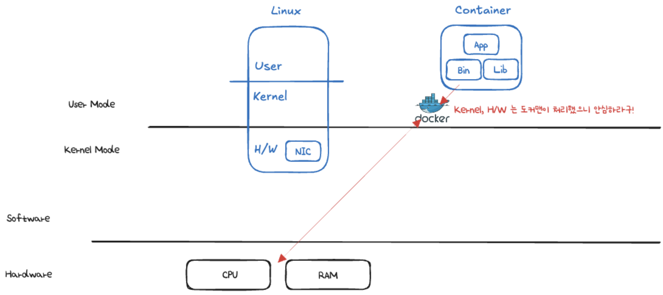 대신에 OS를 별도 격리 하지 않으니 호스트 OS(커널)를 공유하게 됩니다.