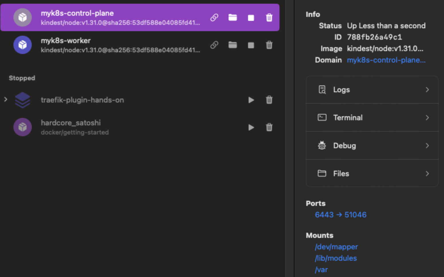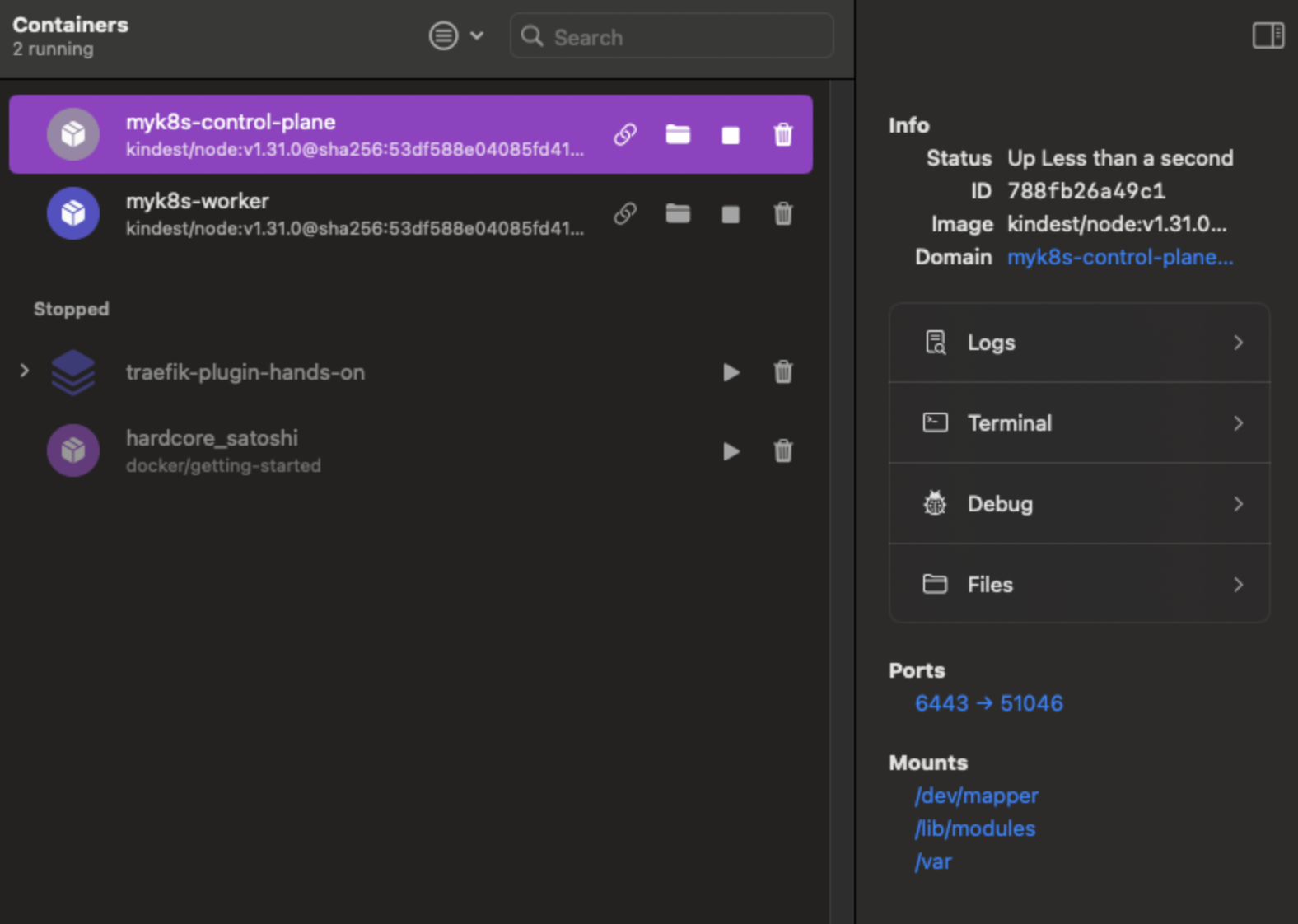 788fb26a49c1 kindest/node:v1.31.0 "/usr/local/bin/entr…" 40 seconds ago Up 38 seconds 127.0.0.1:51046->6443/tcp myk8s-control-plane