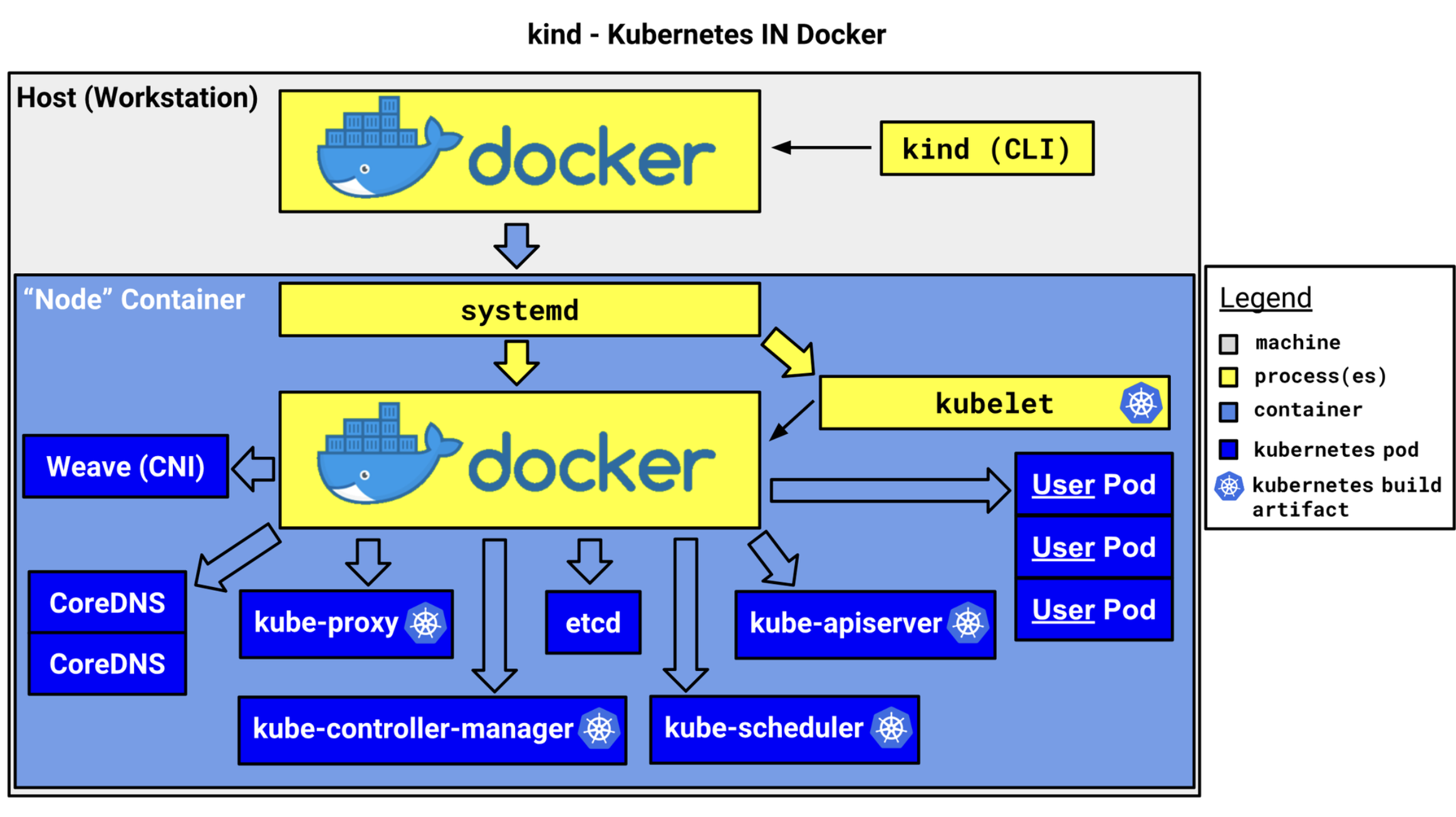 Kind는 Docker in Docker 구조로 구성되어 있다고 합니다.