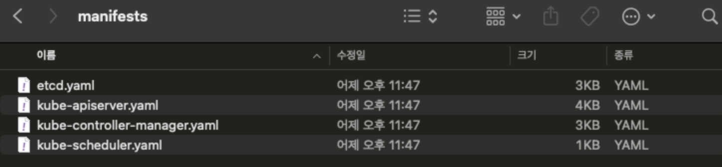 /etc/kubernetes/manifests 경로로 가보면 아래와 같이 저희가 생각하는 파일들이 있는 모습을 볼 수 있습니다.