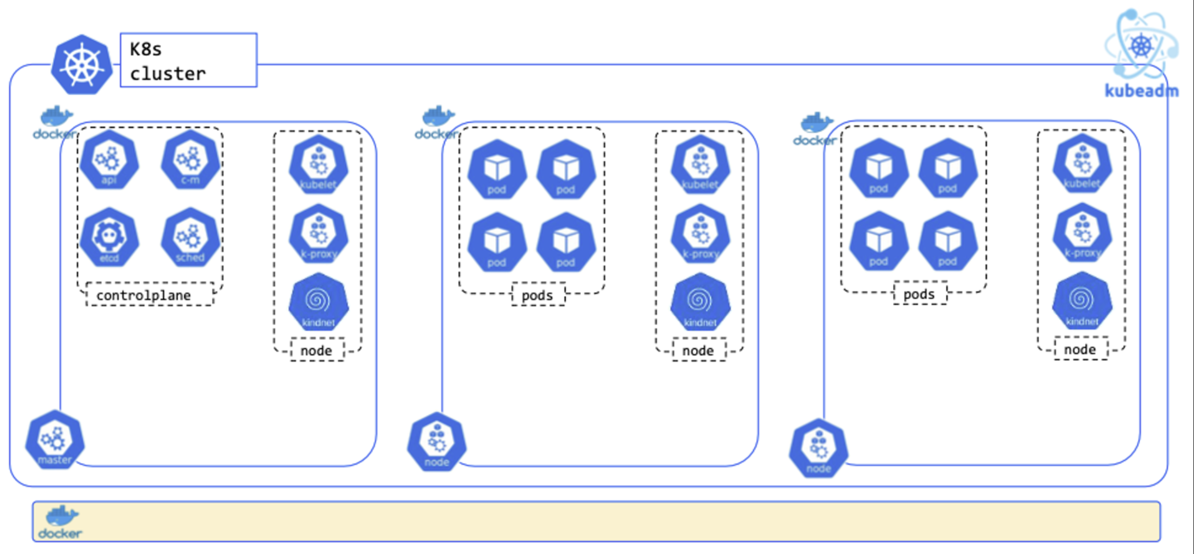 docker가 떠서 "컨테이너"로 된 컨트롤 플레인 노드, 워커 노드를 띄우고 그 안에서 docker가 다시 pod를 띄우는 모습을 볼 수 있습니다.