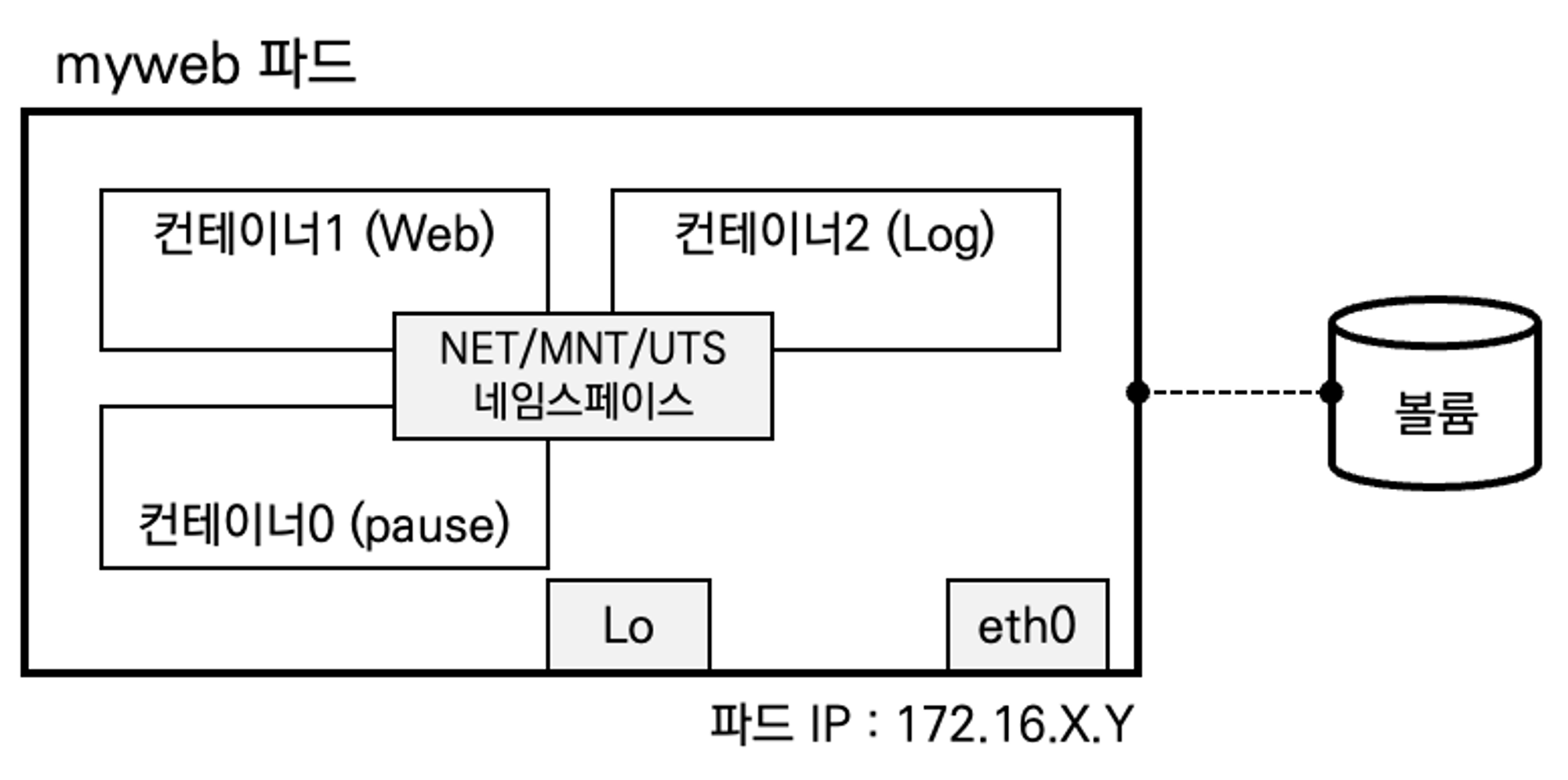 - Pod 내에 실행되는 컨테이너들은 반드시 동일한 노드에 할당되며 동일한 생명 주기를 갖습니다 : Pod 삭제 시, Pod 내 모든 컨테이너가 삭제됩니다.