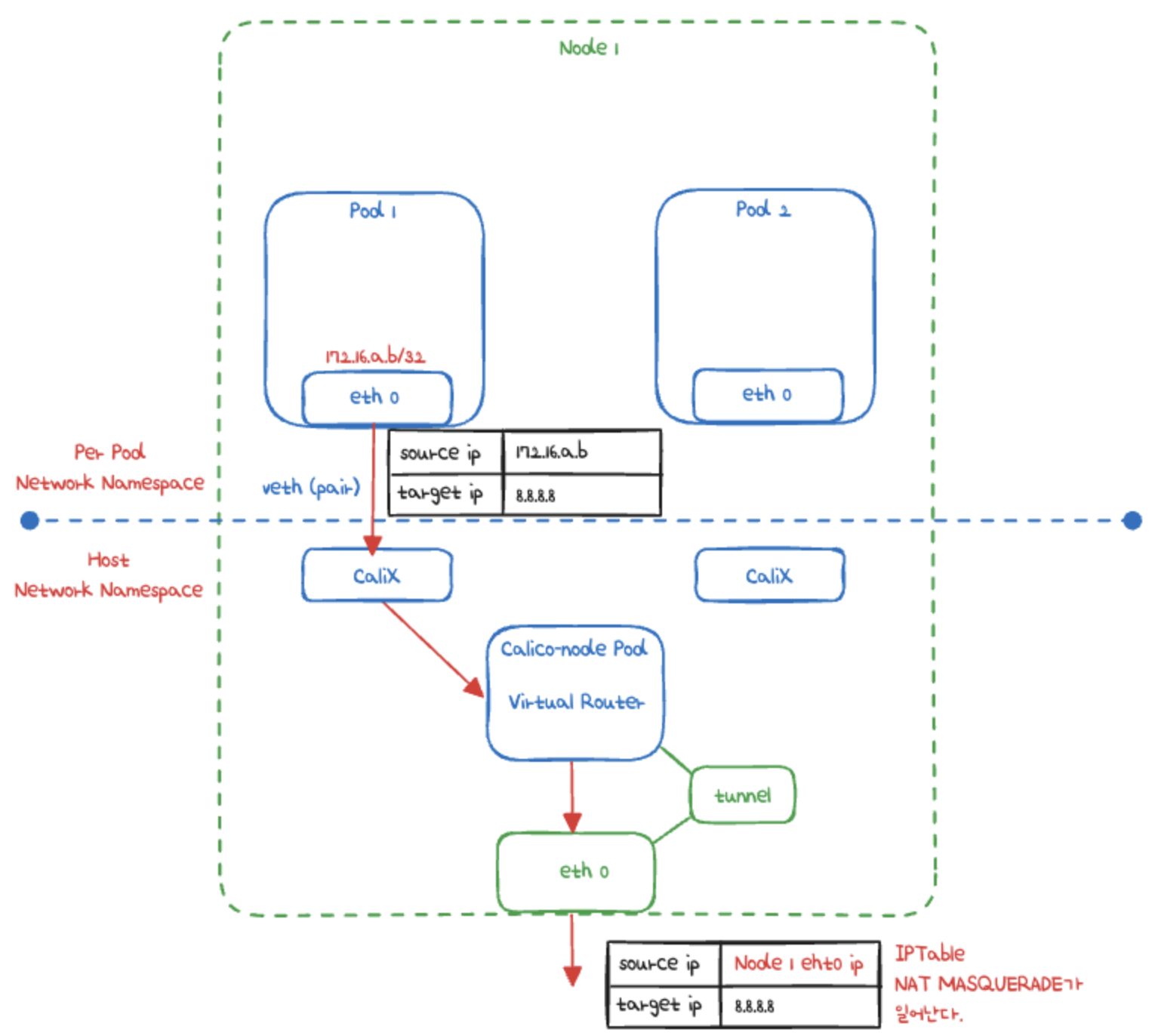 Calico는 이렇게 NAT(Network Address Translation) 규칙을 설정하여 Kubernetes 클러스터 내에서 Pod가 외부 네트워크로 트래픽을 보낼 때 NAT 처리를 수행합니다.