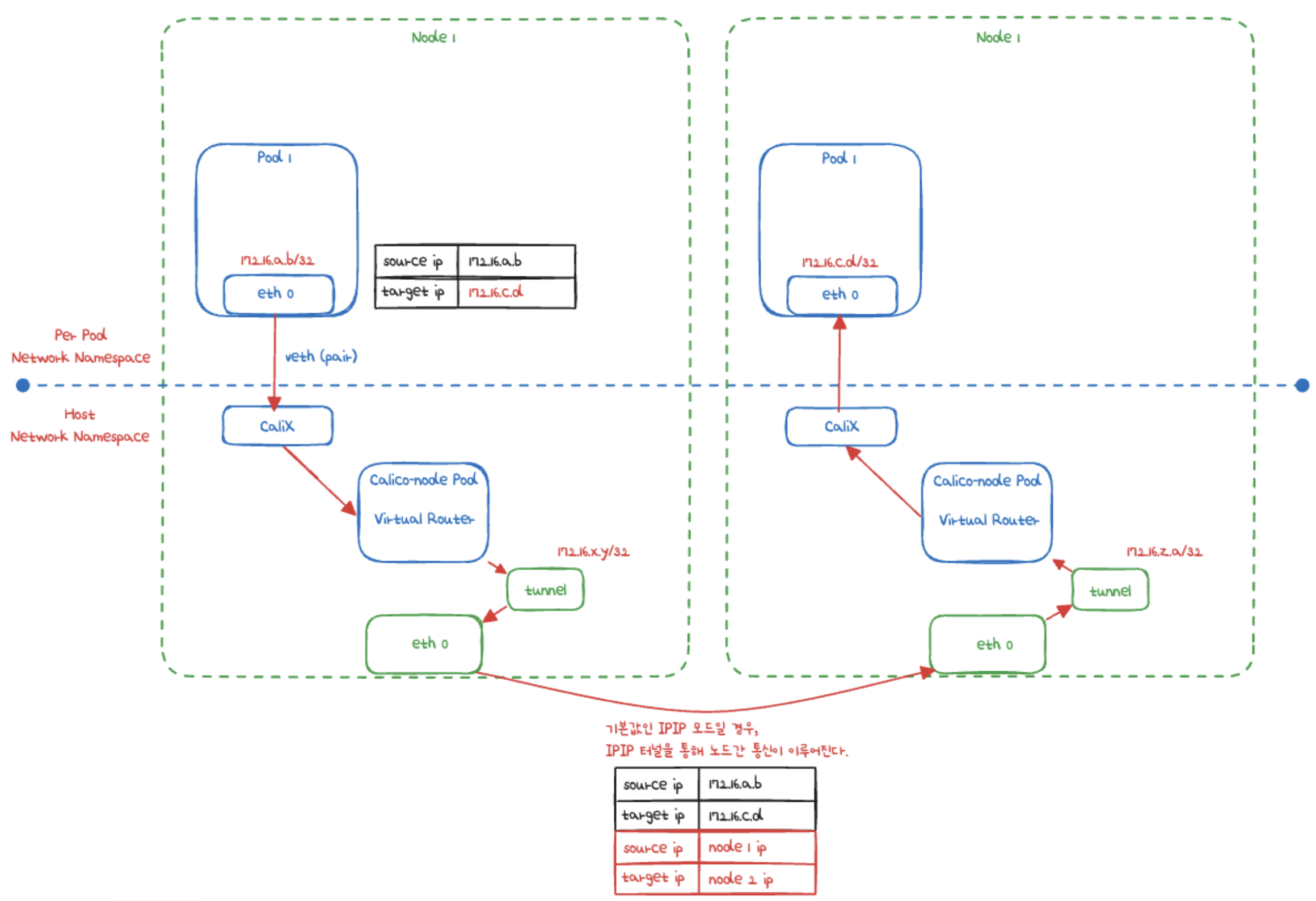 위에서 설명한 서로 노드 간 파드 통신은 Default 모드인 IPIP 모드의 경우입니다.