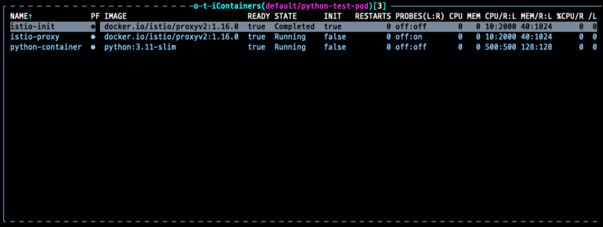 서로 sidecar container로 떠 있어서 같은 네트워크 네임스페이스 4026535635를 사용하고 있다는 사실을 알 수 있습니다.