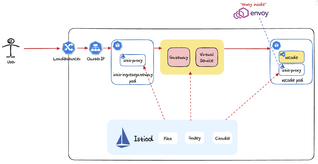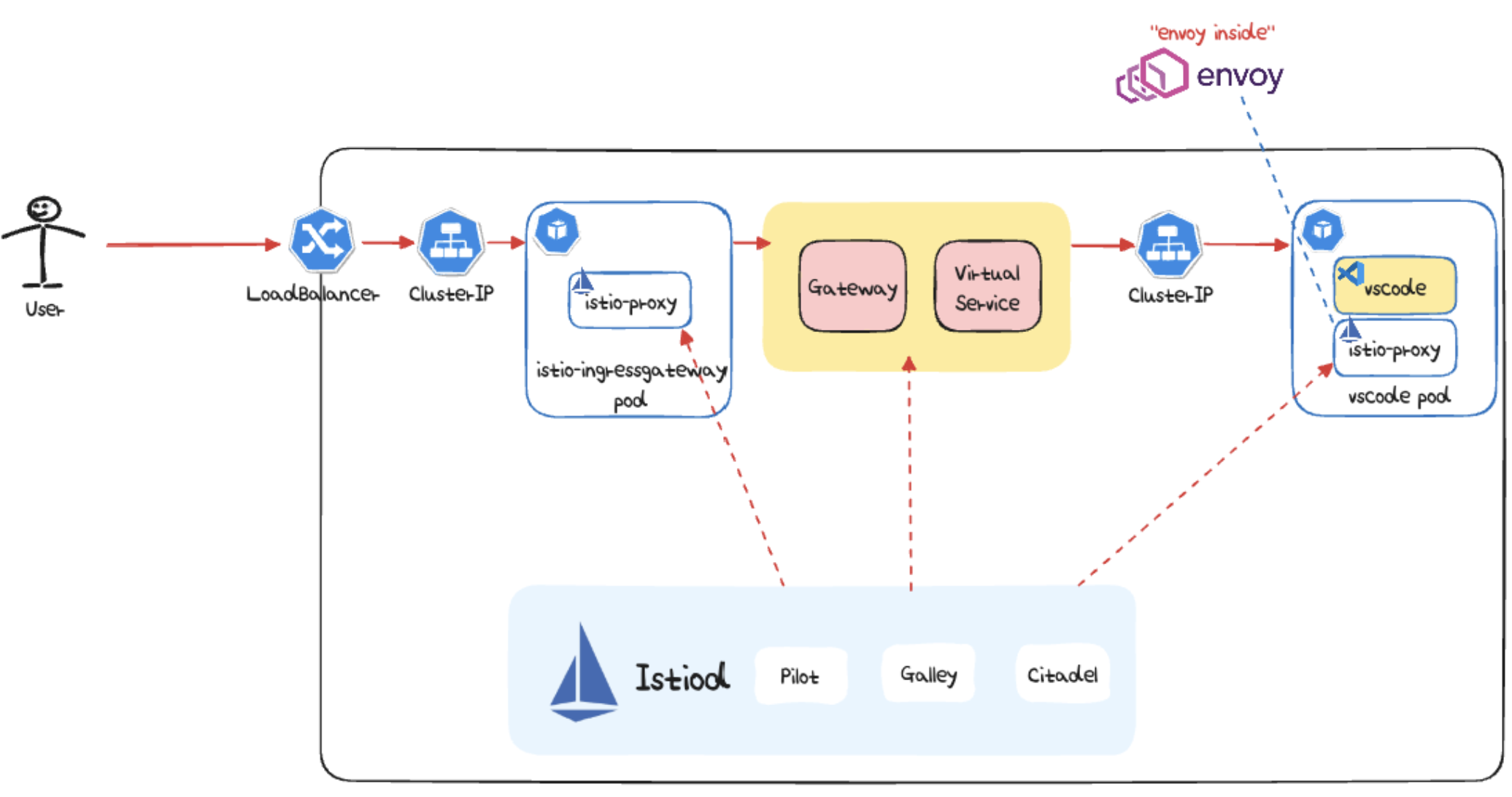 - 모든 Envoy 사이드카에서 프록시 라우팅 규칙을 관리하며, 서비스 디스커버리와 로드 밸런싱 설정을 제공합니다.
