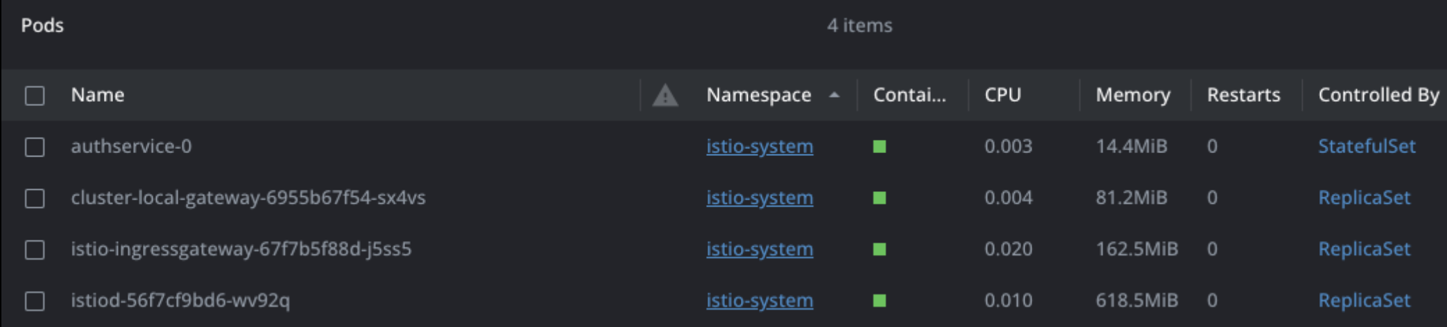 istio-system namespace에서 아래와 같은 구성요소들을 볼 수 있습니다.