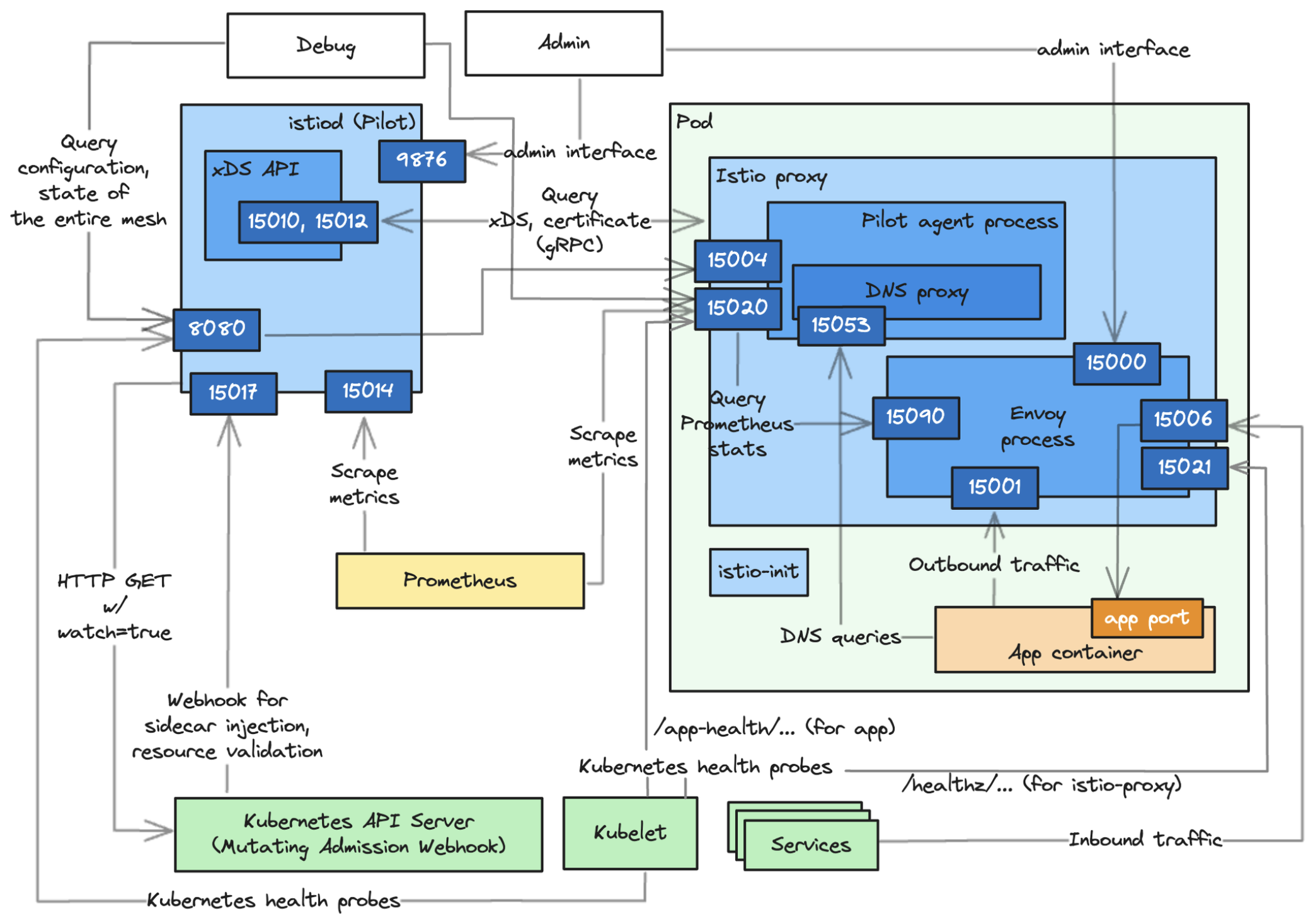 pilot-agent는 envoy와 상호작용하여 프록시의 동작을 제어하고 설정을 전달합니다. 15004, 15020 포트를 통해 Istio 컨트롤 플레인과 통신하며, 프록시의 상태를 유지 관리합니다.