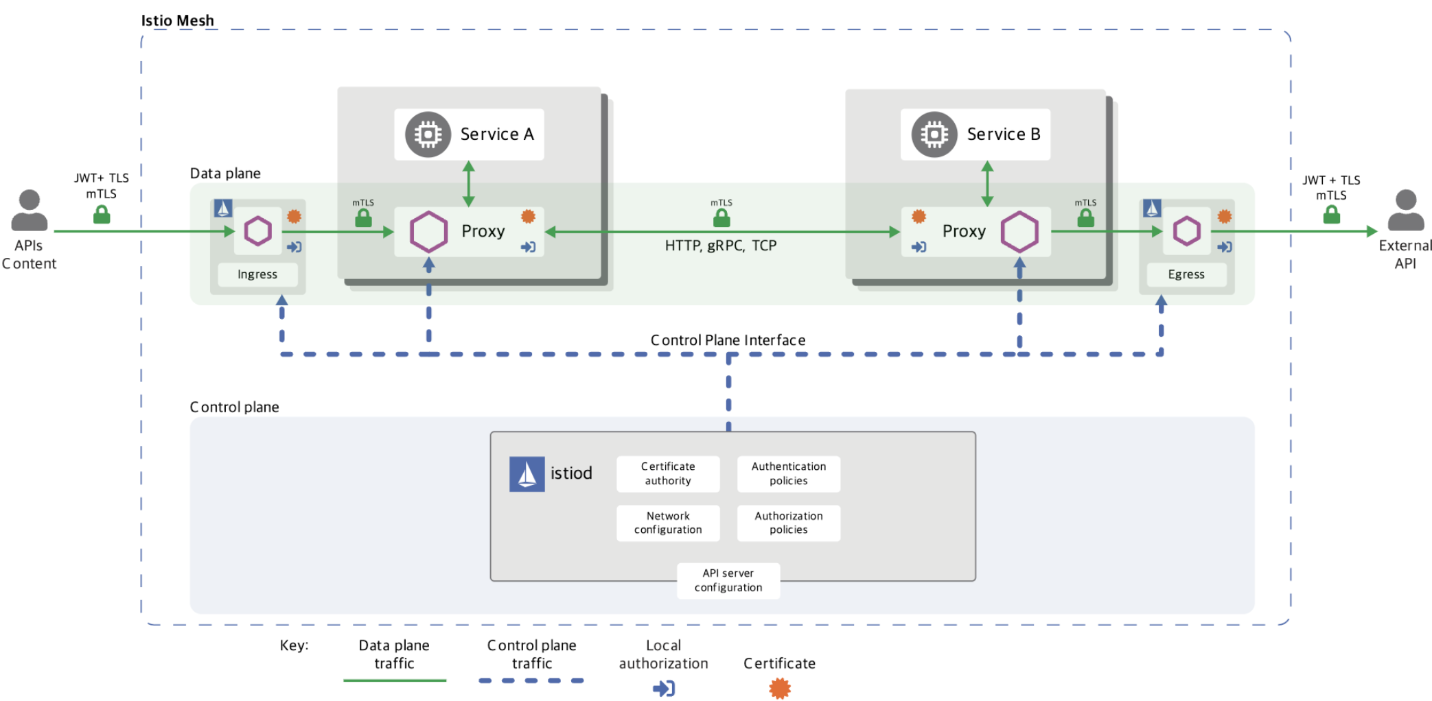 - Citadel: 보안 기능을 담당하며, TLS 인증서 발급 및 관리를 통해 서비스 간 통신의 암호화를 수행합니다.