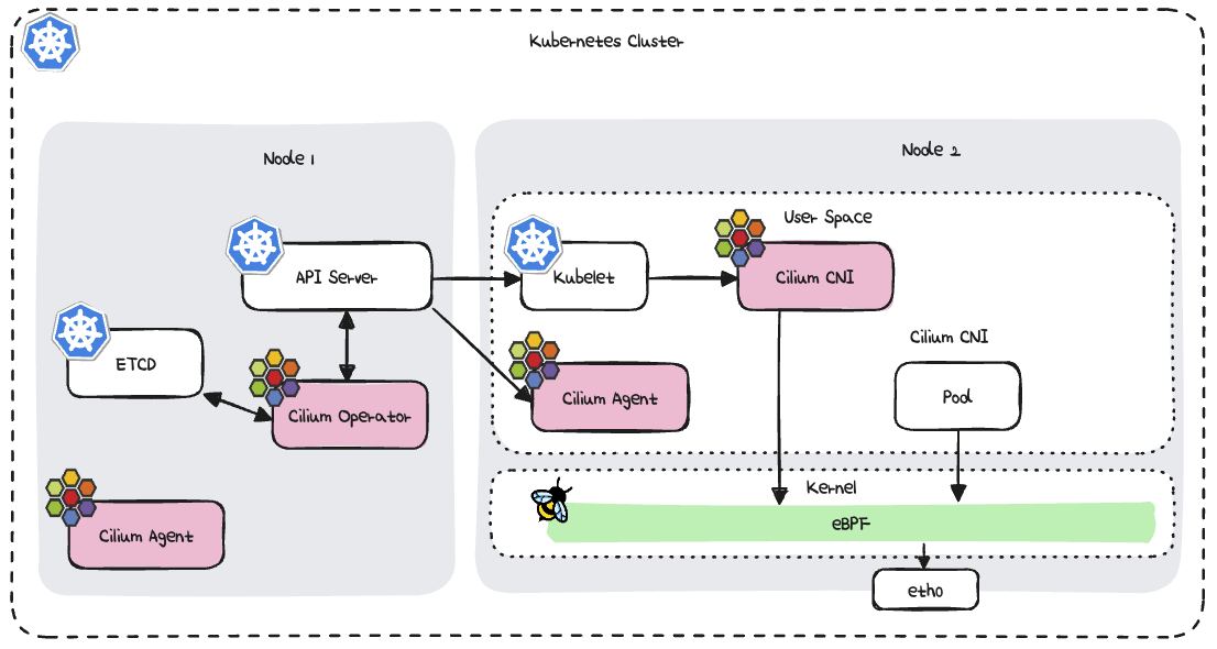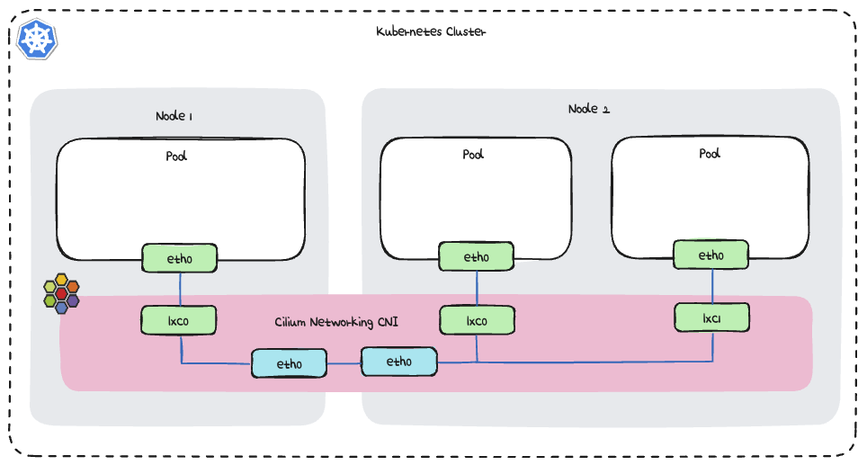 그리고 Cilium CNI가 각 노드들을 연결하는 모습을 구조로 그려보면 아래와 같습니다.