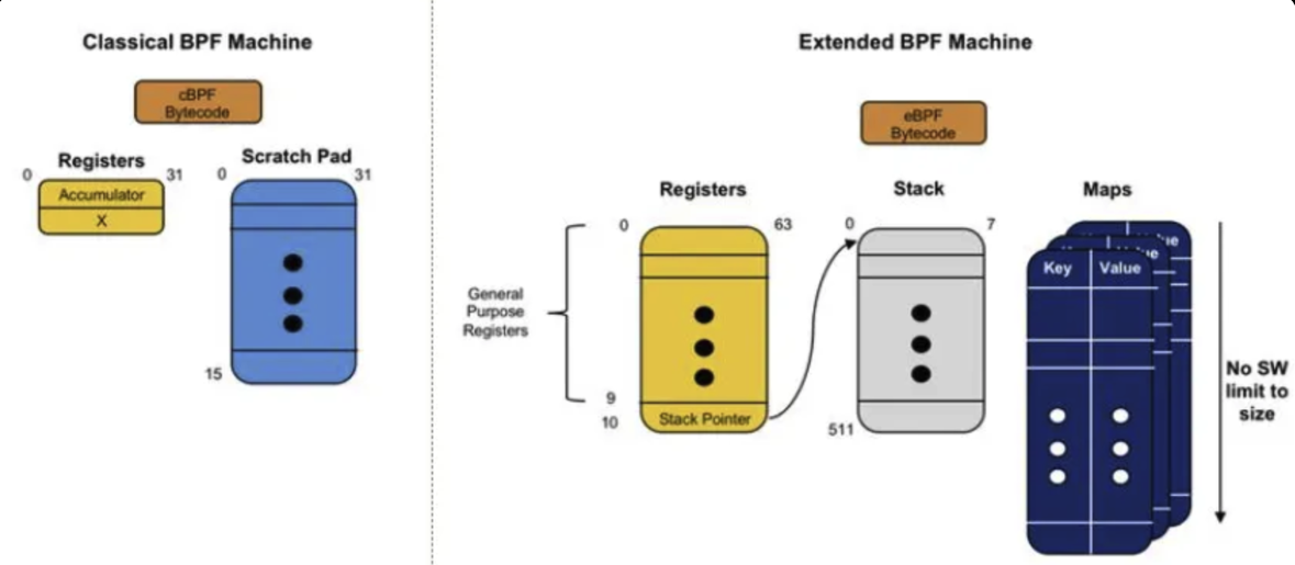 BPF와는 레지스터와 그 레지스터들의 스택이 존재하며, limit 제한이 없는 Maps가 존재한 다는 구조상 차이가 있습니다.