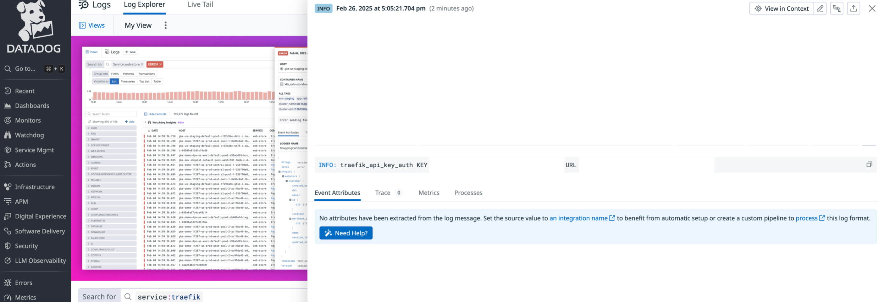 이번 테스트는 Traefik에서 나오는 로그를 Datadog으로 전송하여 확인하는 것입니다.