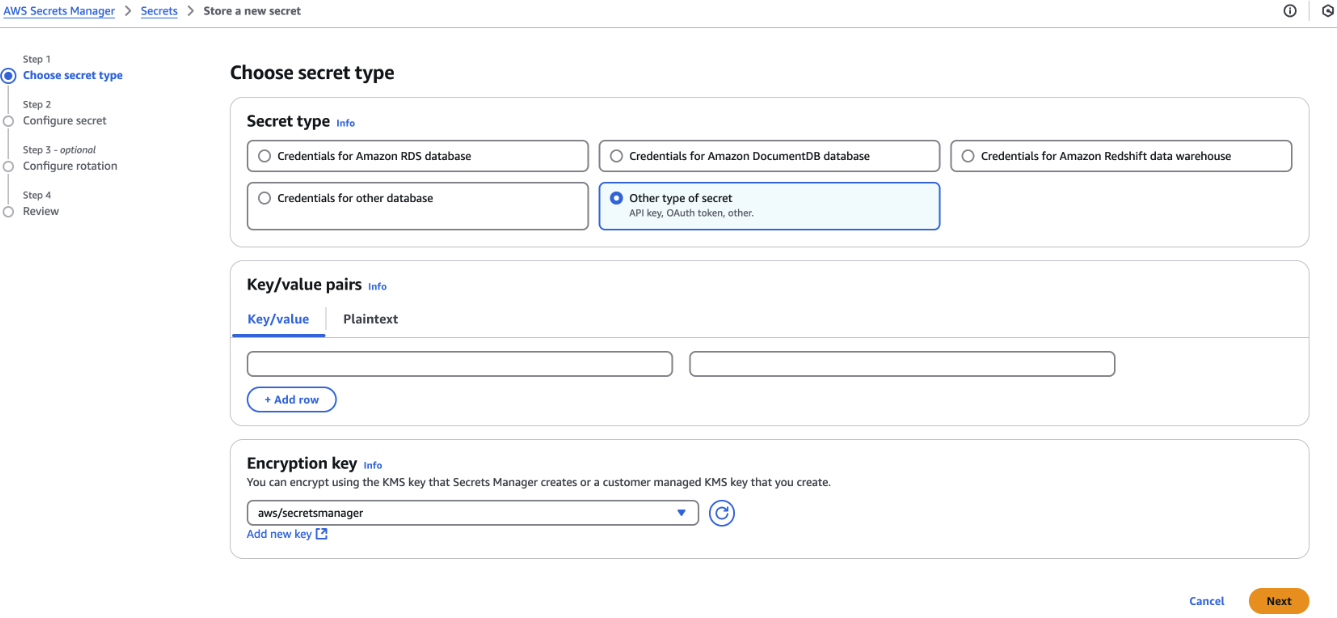 그리고 AWS Secret Manager에 Secret을 하나 등록합니다.