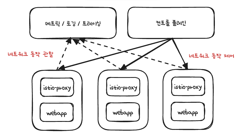 - 이스티오의 데이터 플레인 프록시, 엔보이는 서비스 간 네트워크 요청 경로에 있다.