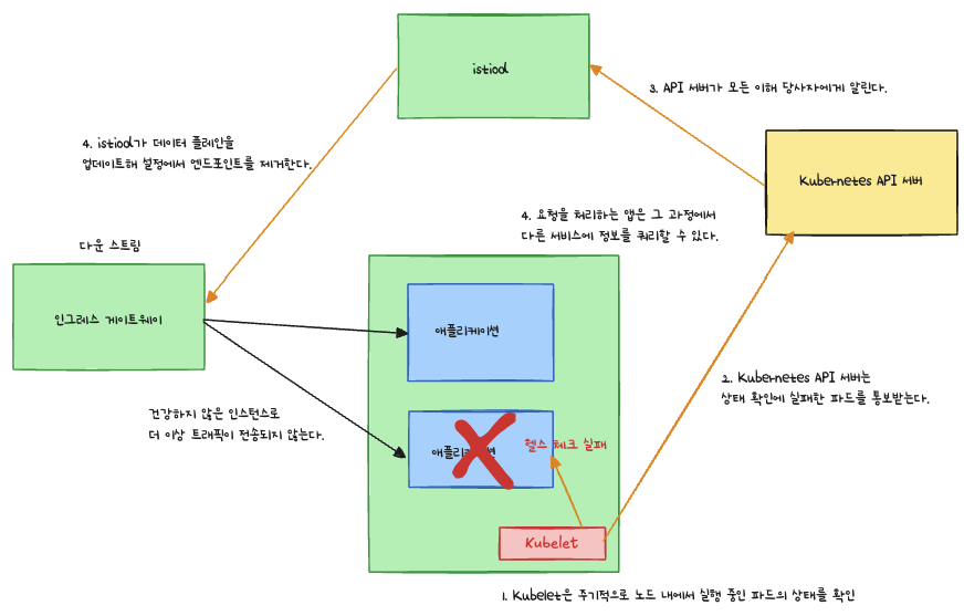 - 이런 엔드포인트 중 하나가 비정상이 되면 쿠버네티스는 이를 인지하고 파드를 비정상을오 표시하는데 시간이 걸리고, 컨트롤 플레인도 문제를 인지하고 엔드포인트를 데이터 플레인에서 제거