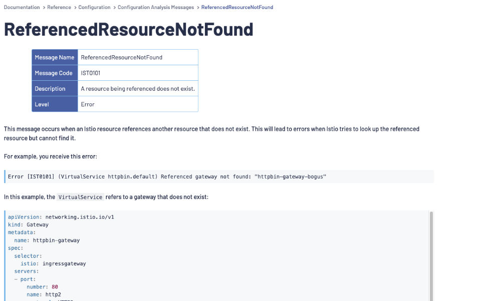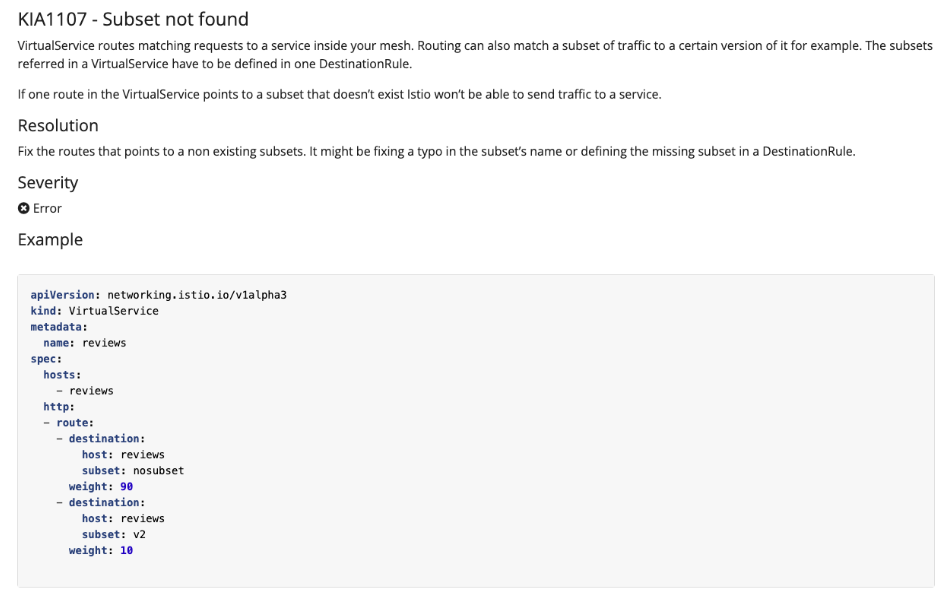 istioctl analyze -n istioinaction 2025-10-26T05:23:38.971889Z error kube translation function for core/v1alpha1/MeshConfig not found controller=analysis-controller 2025-10-26T05:23:38.972204Z error kube translation function for core/v1alpha1/MeshNetworks not found controller=analysis-controller Error [IST0101] (VirtualService istioinaction/catalog-v1-v2) Referenced host+subset in destinationrule not found: "catalog.istioinaction.svc.cluster.local+version-v1" Error [IST0101] (VirtualService istioinaction/catalog-v1-v2) Referenced host+subset in destinationrule not found: "catalog.istioinaction.svc.cluster.local+version-v2" Error: Analyzers found issues when analyzing namespace: istioinaction. See https://istio.io/v1.27/docs/reference/config/analysis for more information about causes and resolutions.