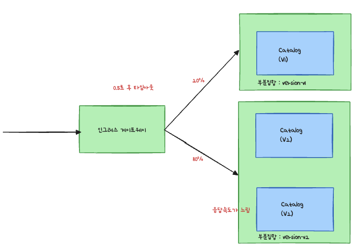 요청 처리 제한 시간이 0.5초가 되도록 VirtualService를 설정