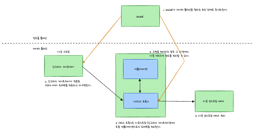 - 서비스 프록시 : 접근 제어 기능을 제공하고, 다운스트림에서 로컬 애플리케이션으로 흐르는 트래픽을 처리