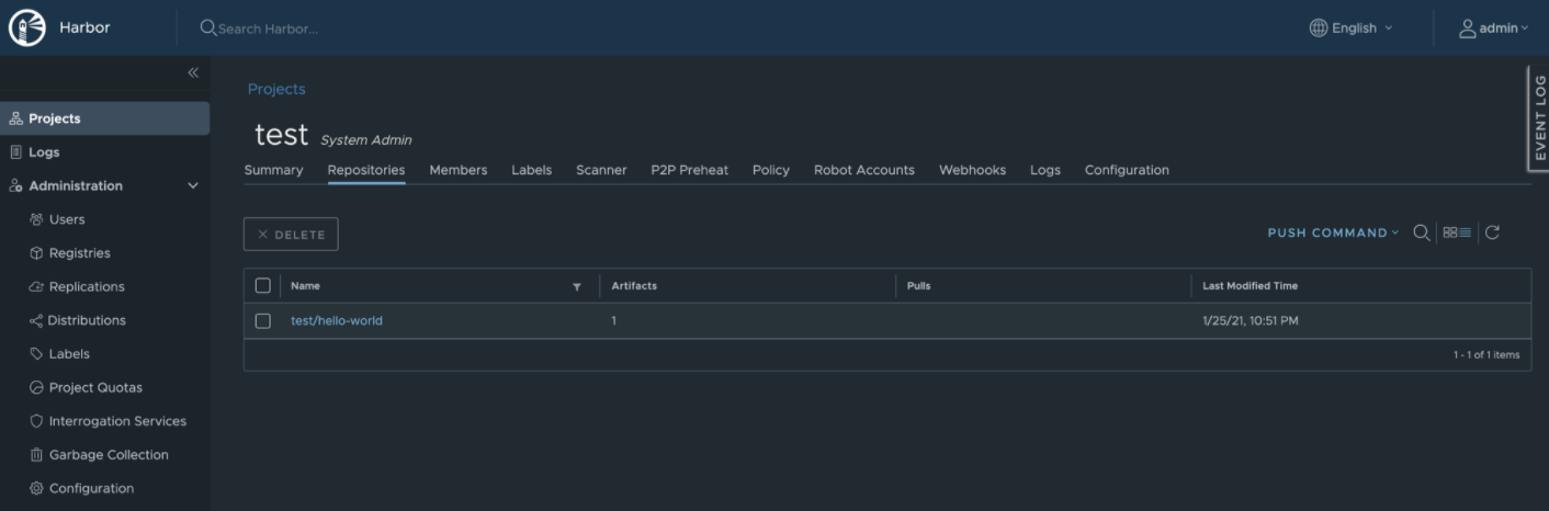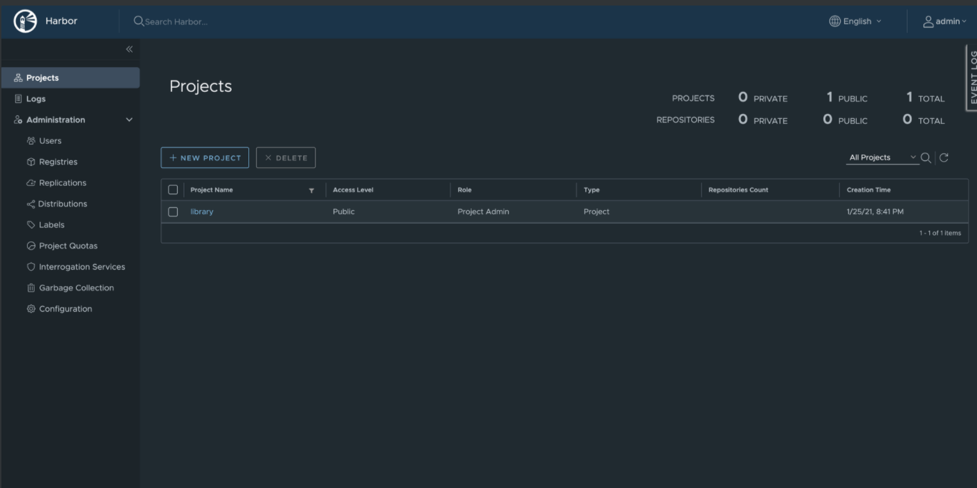 id/pw 기본값은 admin/Harbor12345 이고 로그인하면 아래와 같은 화면을 볼 수 있다.